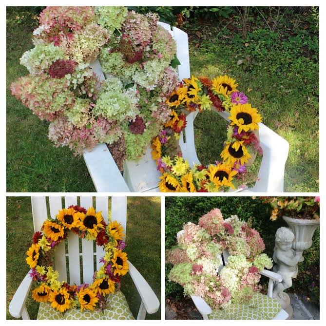 If you have flowers at home, capitalize on them by using them in your fall wreath! Mums, hydrangeas, and even sunflowers can make beautiful additions to any wreath. If you are feeling festive, try adding a couple mini pumpkins or ornamental corn to your wreath. In my garden we have a huge hydrangea bush and mums so I chose to use those. I also purchased a bouquet of sunflowers from a local grocery store to make two festive wreaths. One was made up of primarily hydrangeas; this wreath will dry over time but the flowers will not shrivel up or fall off. The other was a combination of sunflowers and mums, this wreath is more temporary and great for a housewarming gift or as a temporary decoration for your home. To make your sunflowers and mums last longer, use a spray bottle to spray them with water daily. This will help prevent the flowers from wilting or falling off.