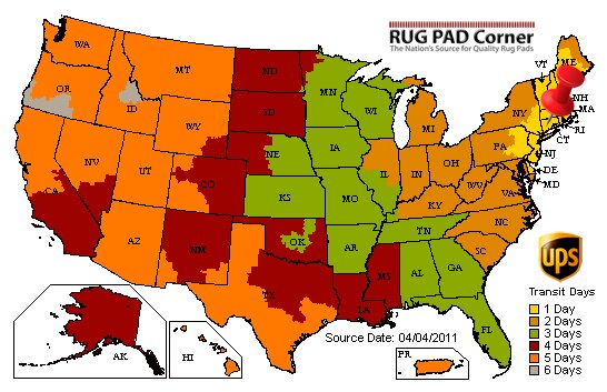 Your rug pad order will be shipped via UPS ground. Certain DURA-GRIP® furniture gripper orders can ship via USPS Priority Mail. Every order is shipped direct from our own warehouse. Ground shipping takes anywhere from 1 day to 5 days to deliver, depending on where you are within the contiguous United States.